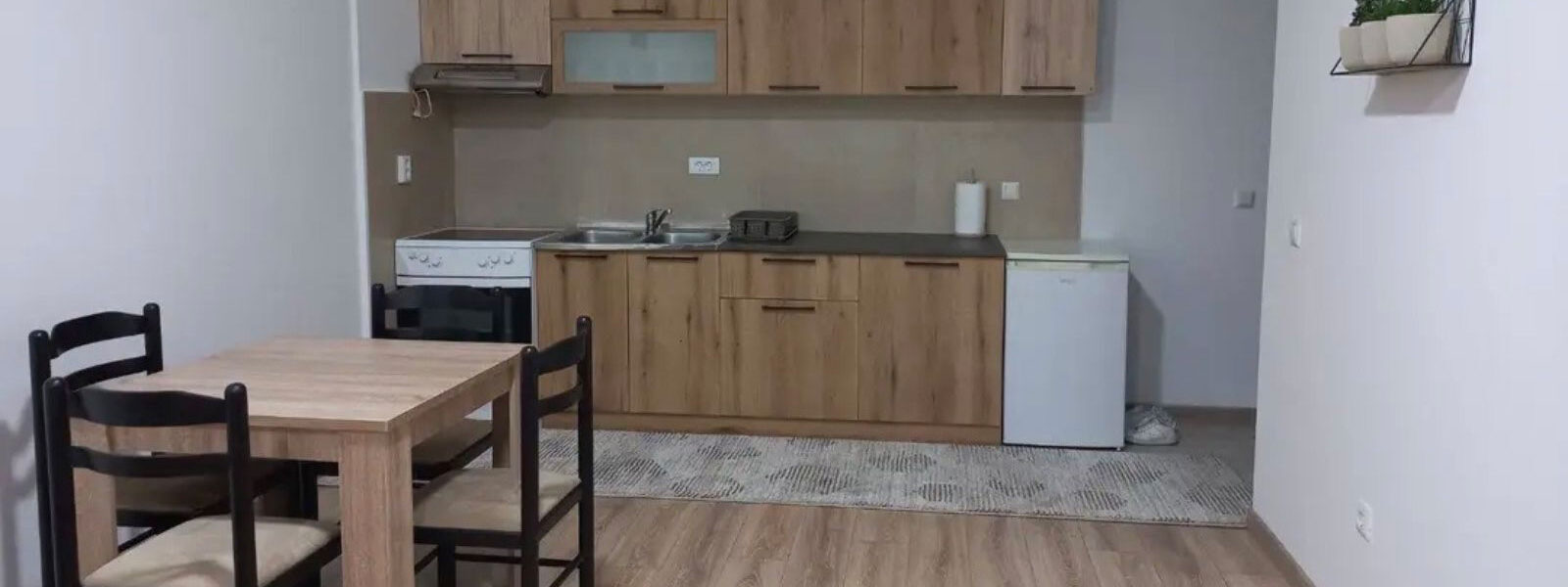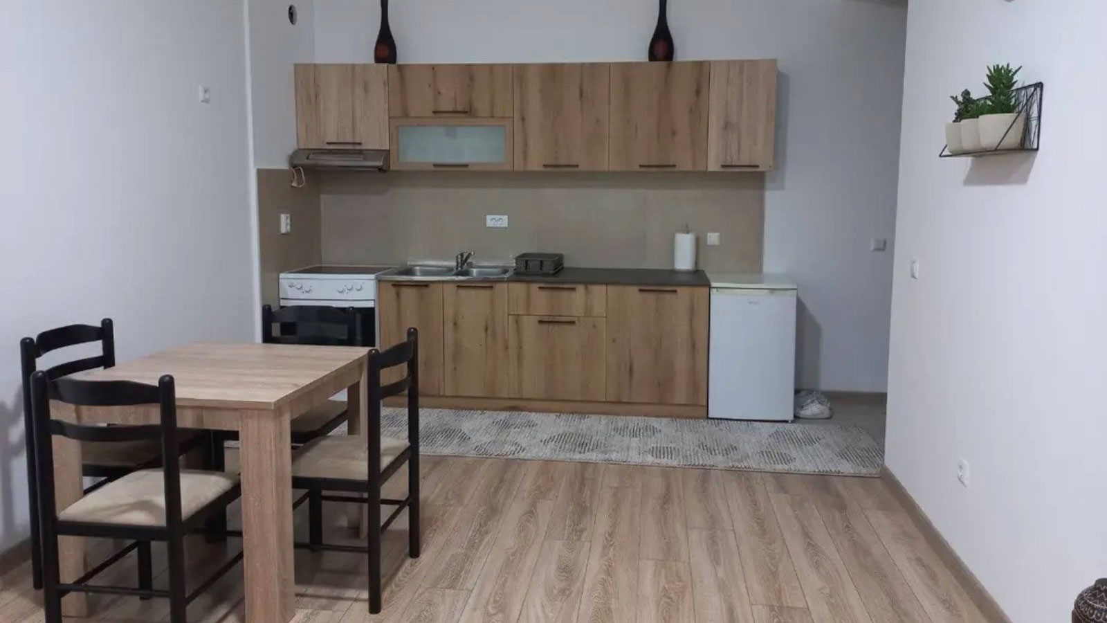 The apartment consists of a living room with a kitchen, two bedrooms, a bathroom and a terrace.