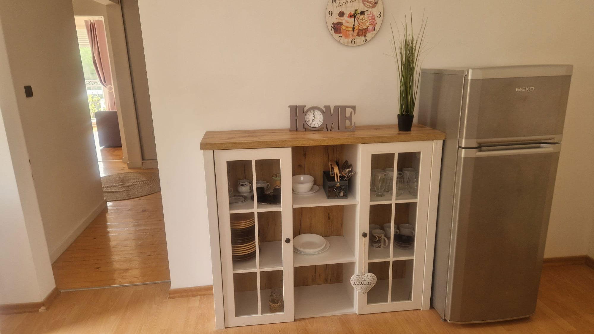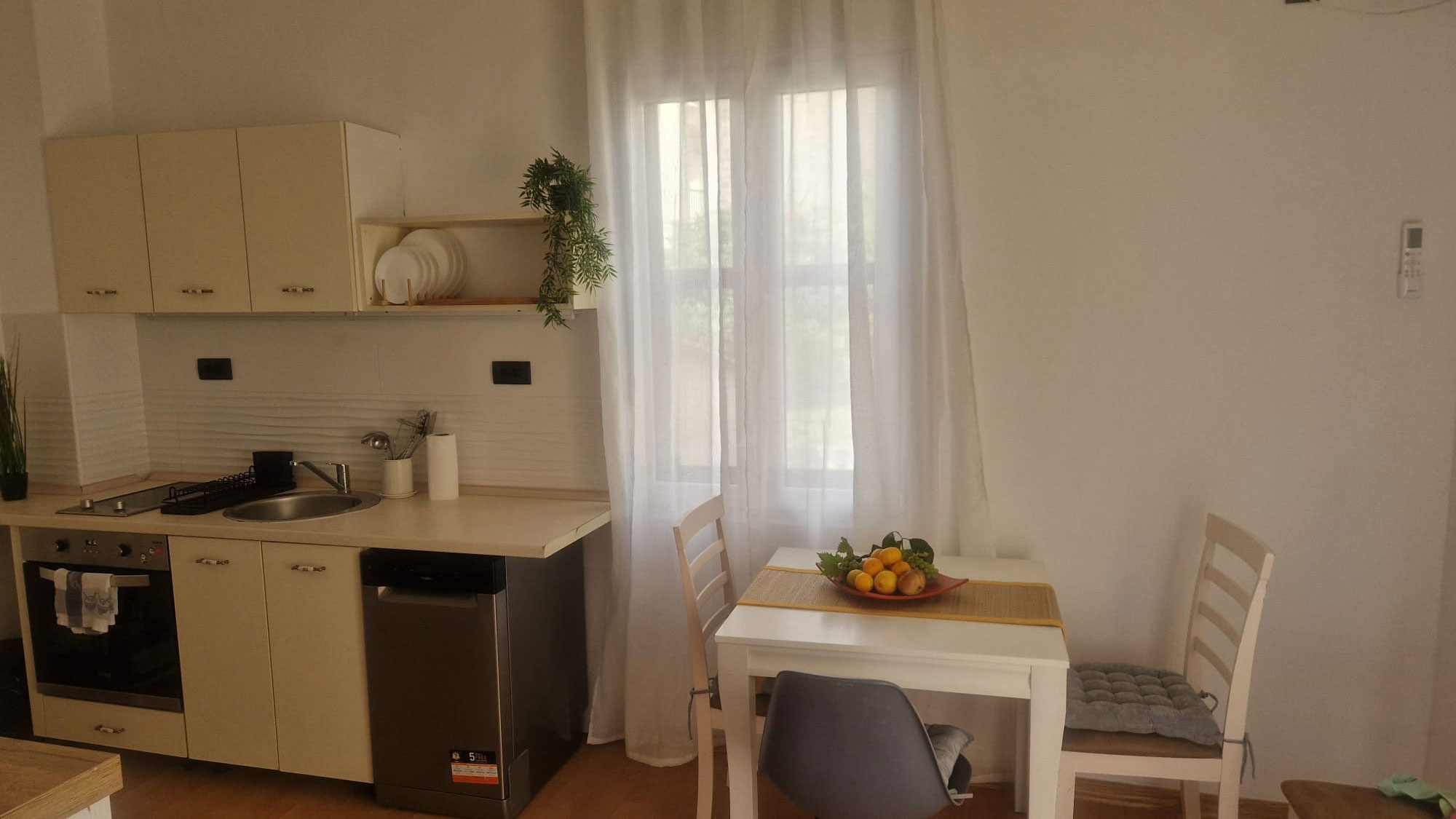 The apartment has a bedroom, a living room, a hallway, a large kitchen, a bathroom and a parking space in front of the house. First floor.