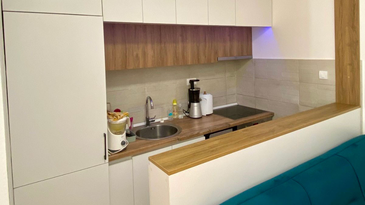 Kuhinja sa kompletnom ugradnom bijelom tehnikom (frižider + zamrzivač, mašina za suđe, rerna, ploča, aspirator)