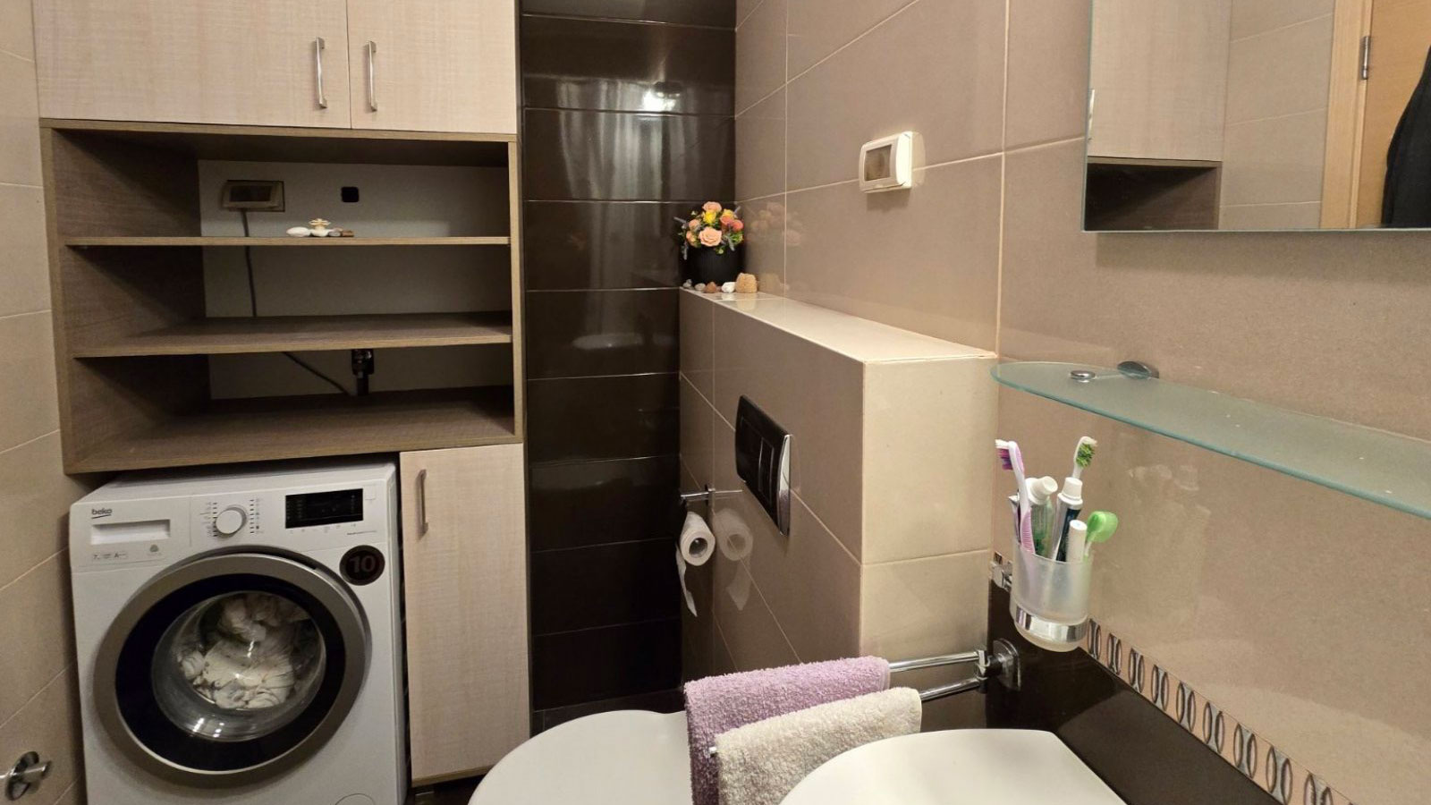 Struktura stana: ulazni hodnik, dnevna soba sa trpezarijom i kuhinjom, terasa, kupatilo i spavaća soba sa terasom koja služi kao vešeraj.