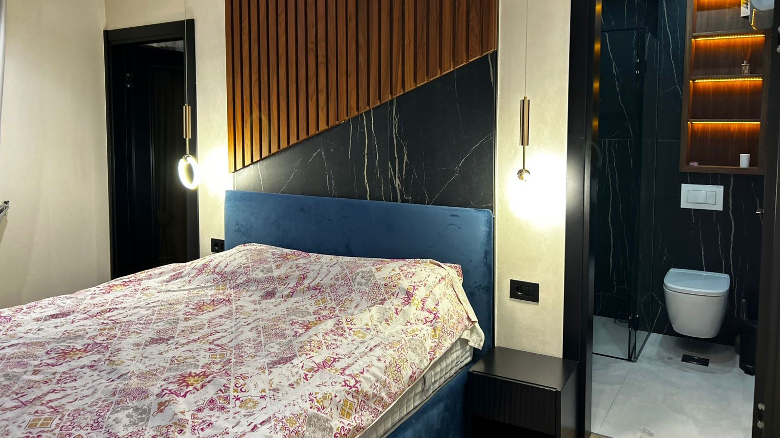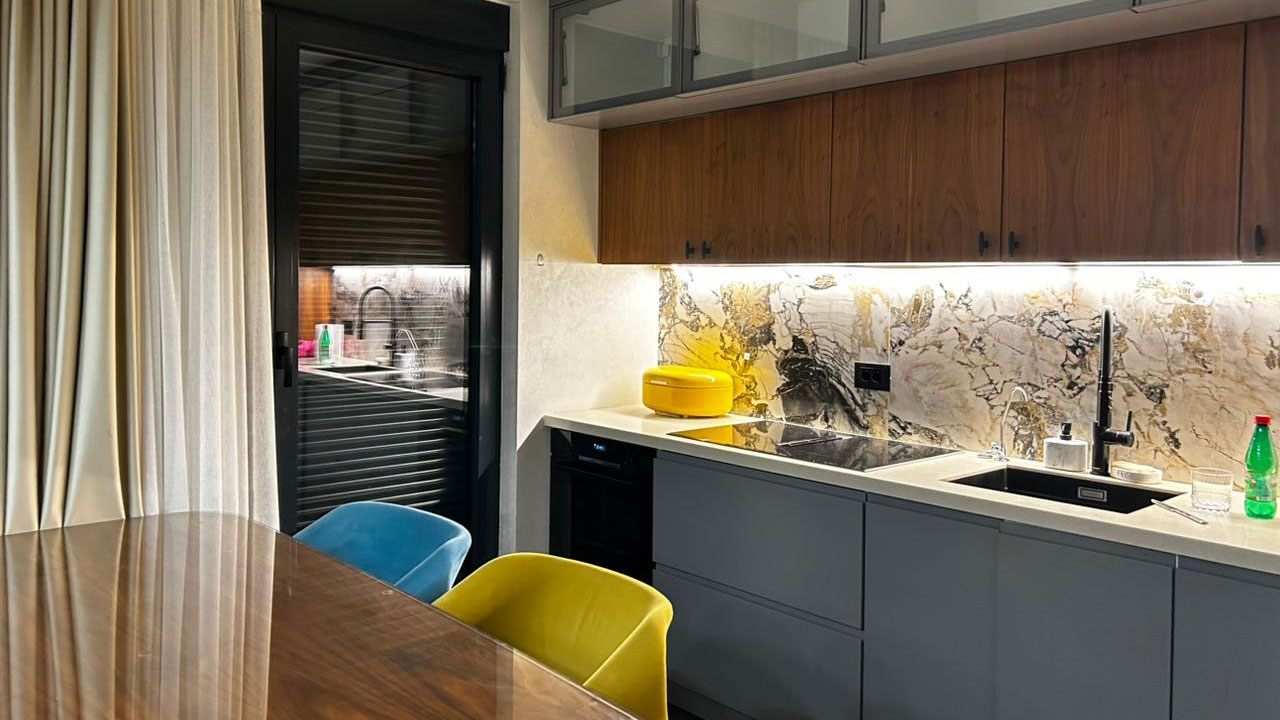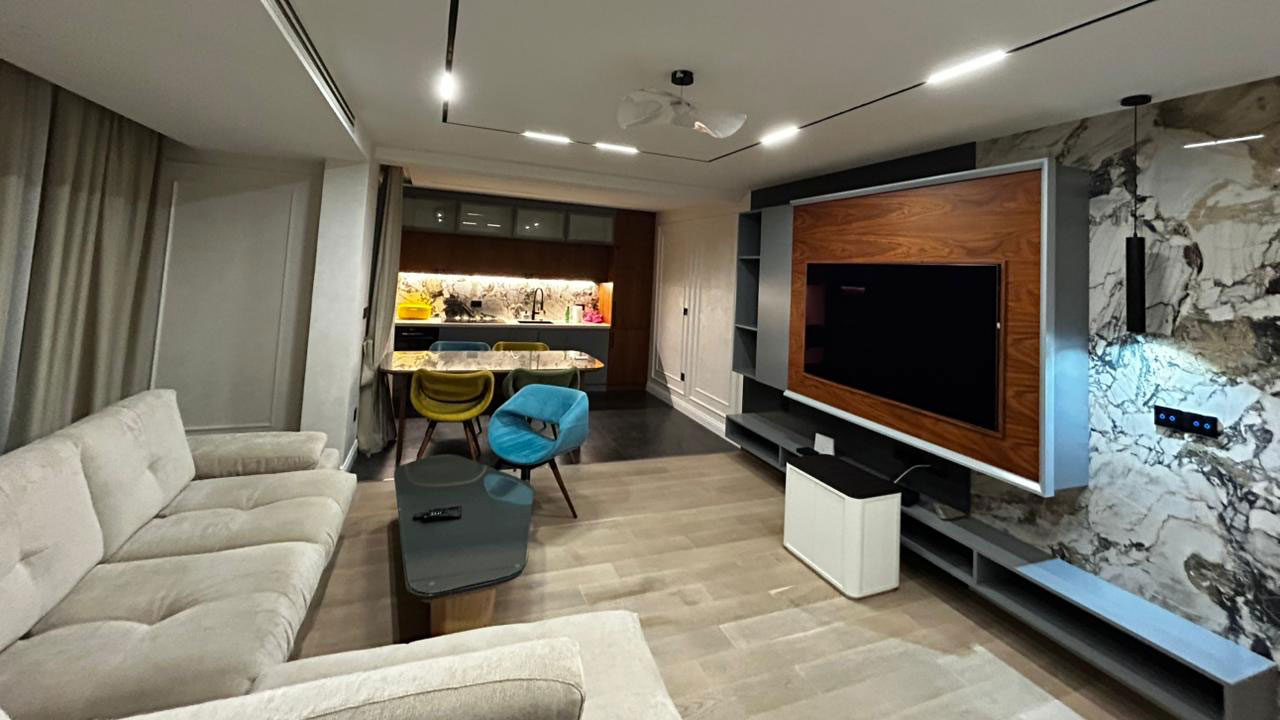 Enterijer je opremljen luksuznim namještajem vrhunskog kvaliteta. Svaka prostorija odiše stilom i toplinom, uz savršeno usklađene detalje koji stvaraju osjećaj sofisticiranog doma. Rasvjeta, klimatizacija i grijanje u cijelom stanu kontrolišu se putem savremenog pametnog sistema – sve je automatizovano i jednostavno za korišćenje. Podno grijanje pruža maksimalan komfor tokom cijele godine.
